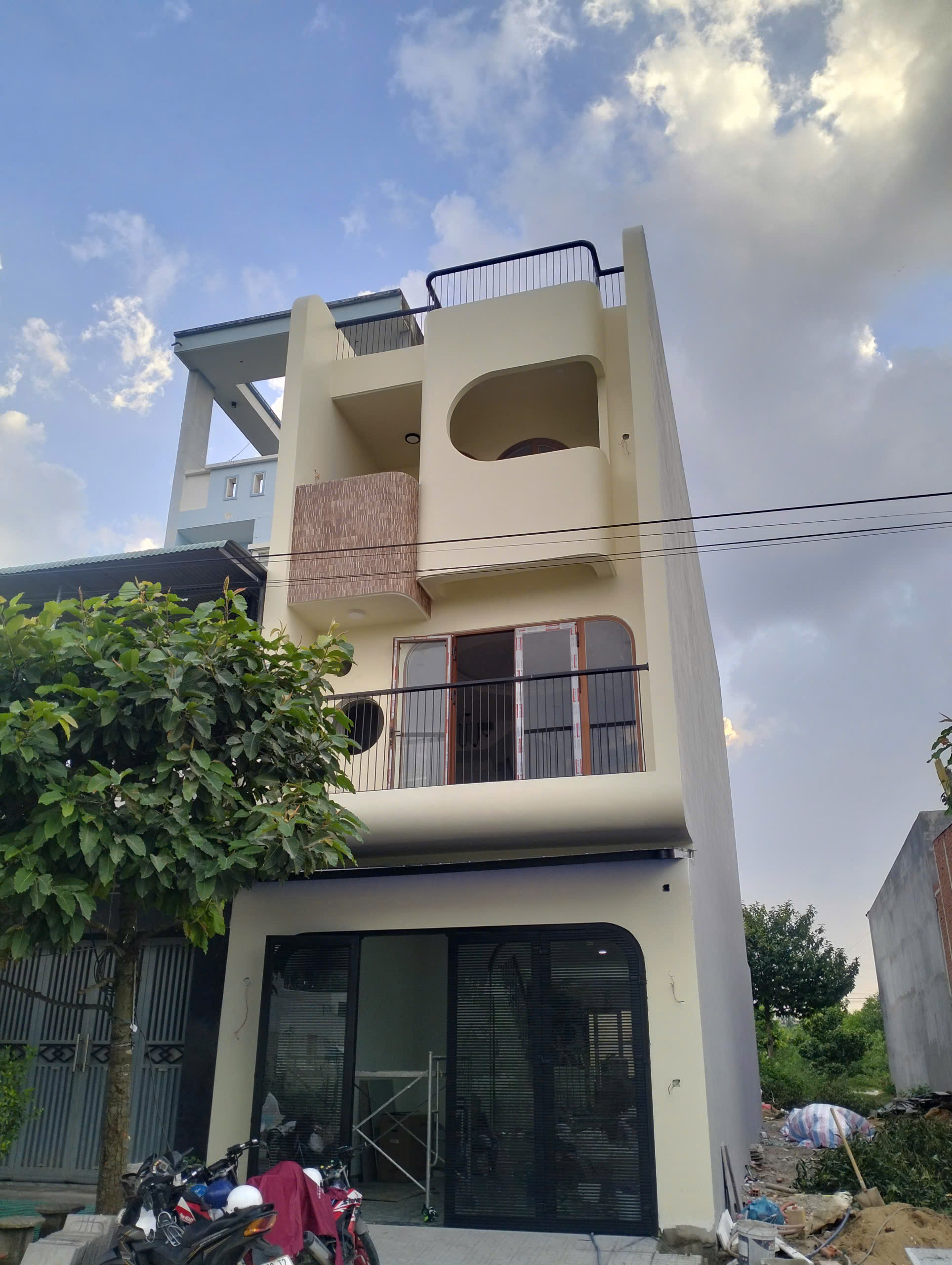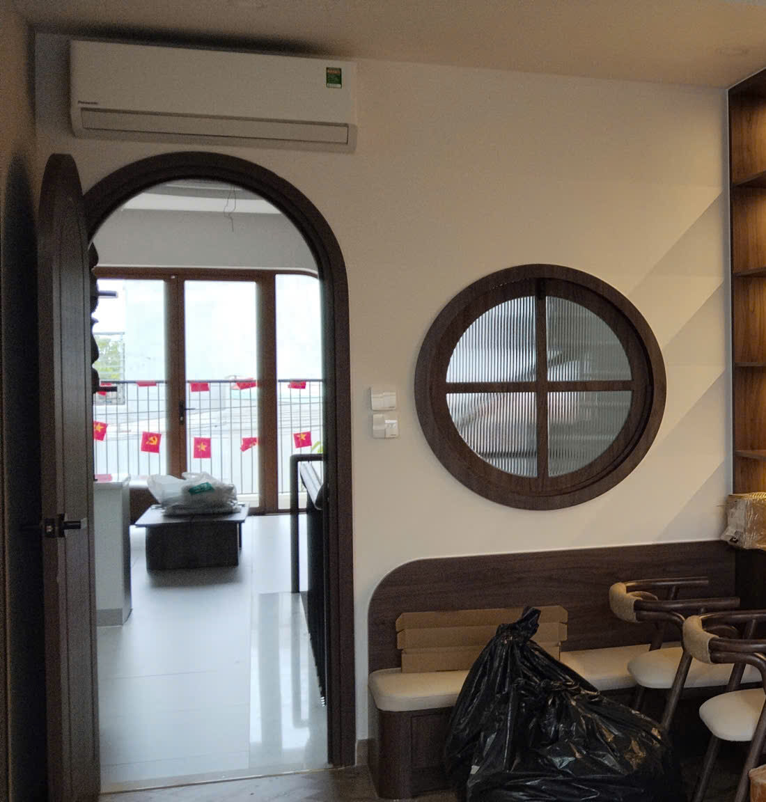 Cửa vòm nghệ thuật: Thay vì những ô cửa vuông vức, chúng tôi sử dụng hệ cửa vòm và cửa sổ tròn (bullseye window), mang lại nét kiến trúc Châu Âu vừa cổ điển vừa hiện đại.