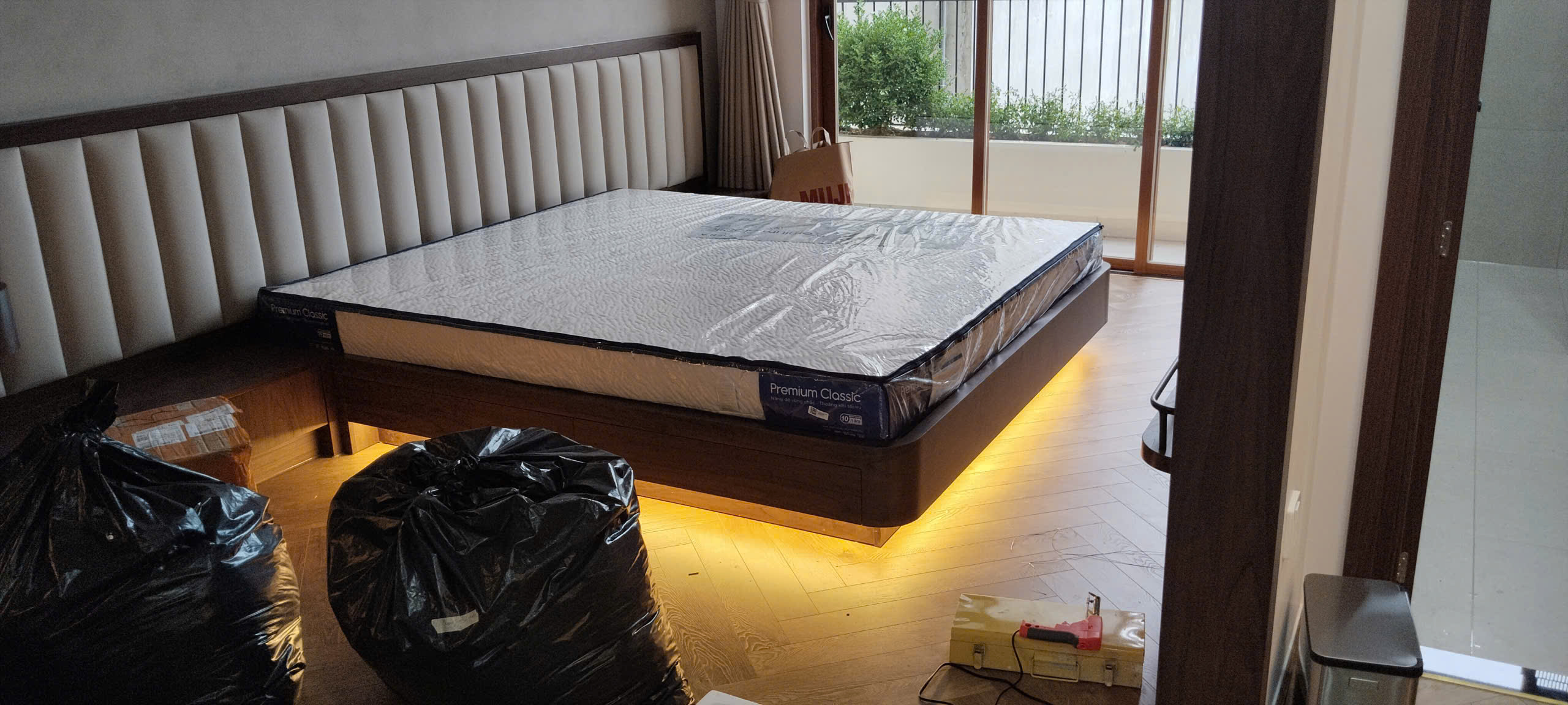 Giường hắt LED: Thiết kế giường dạng phản thấp tích hợp dải LED gầm tạo hiệu ứng “giường bay” sang trọng và ấm cúng. Không gian nghỉ ngơi được tối ưu theo phong cách “Luxury Minimalism”