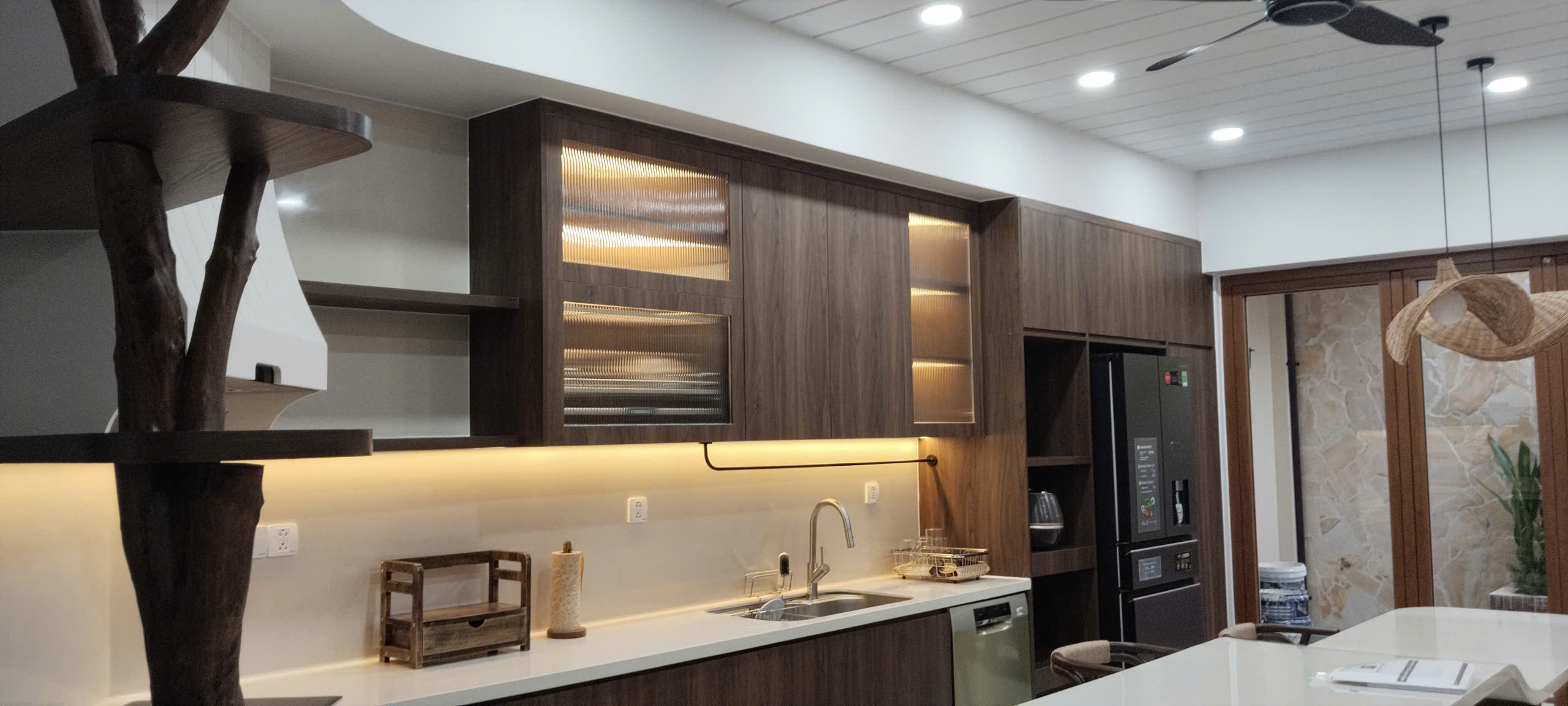 Hình 4. Vách ngăn đá xuyên sáng và hệ tủ kịch trần gắn led