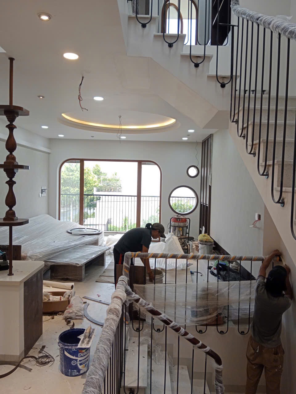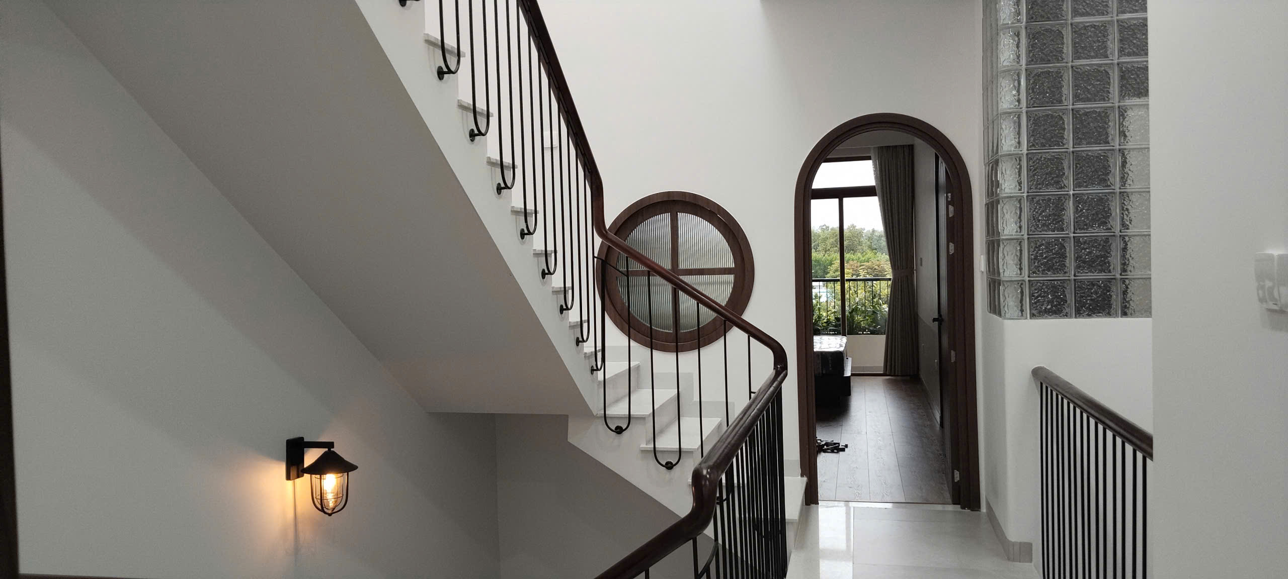 Tay vịn gỗ: Sử dụng gỗ cao cấp với đường nét bo tròn mềm mại, tạo cảm giác cầm nắm chắc chắn và ấm áp. Màu gỗ đồng nhất với hệ cửa vòm và nội thất phòng khách.