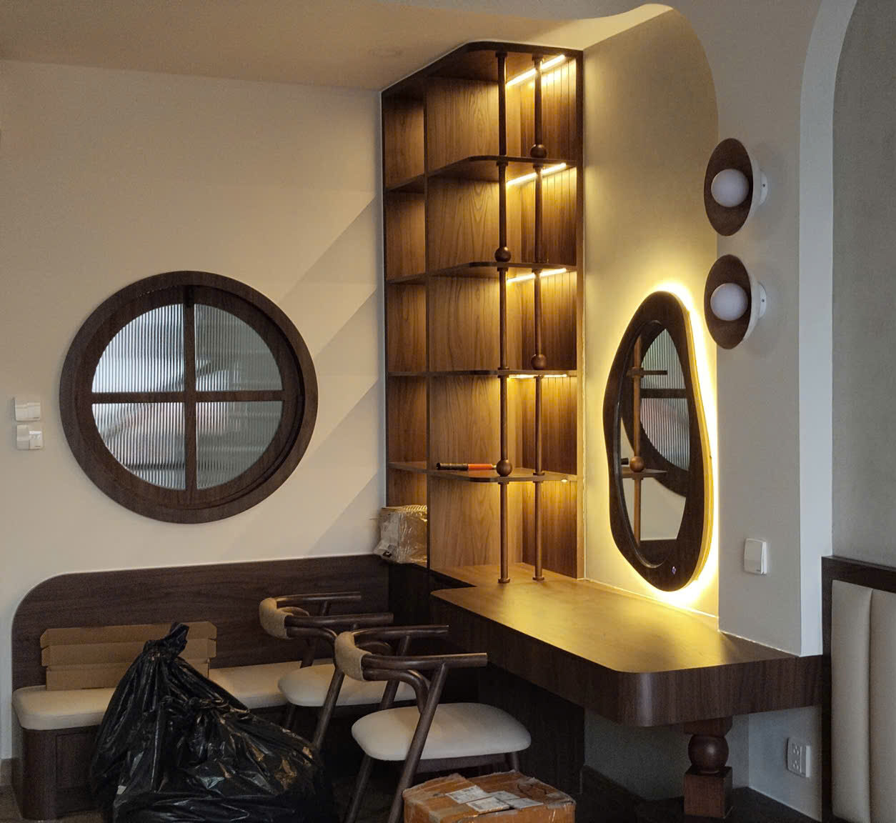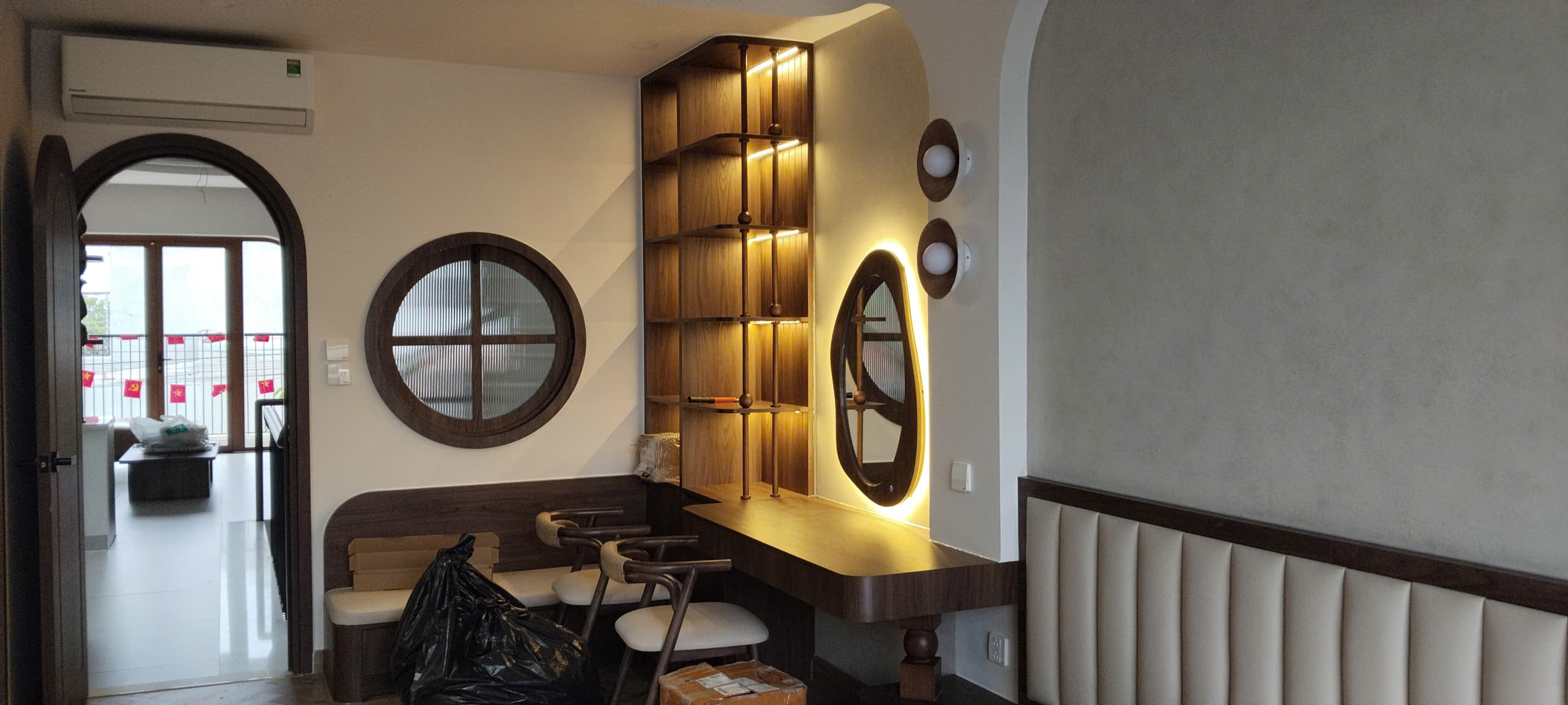 Đèn trang trí: Các hệ đèn gắn tường hình tròn đồng bộ với thiết kế trần và cửa sổ, tạo nên một ngôn ngữ thiết kế nhất quán.