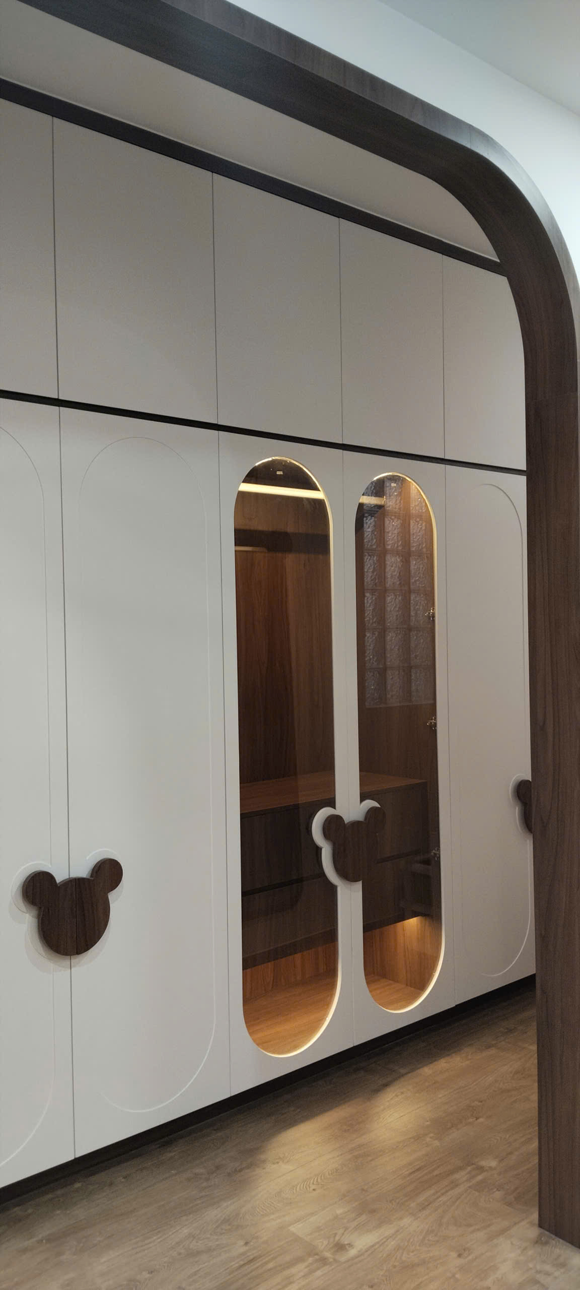 Thiết kế phẳng hiện đại: Cánh tủ không tay nắm giúp mặt đứng thanh thoát như một bức tường gỗ sang trọng, mở rộng không gian thị giác.